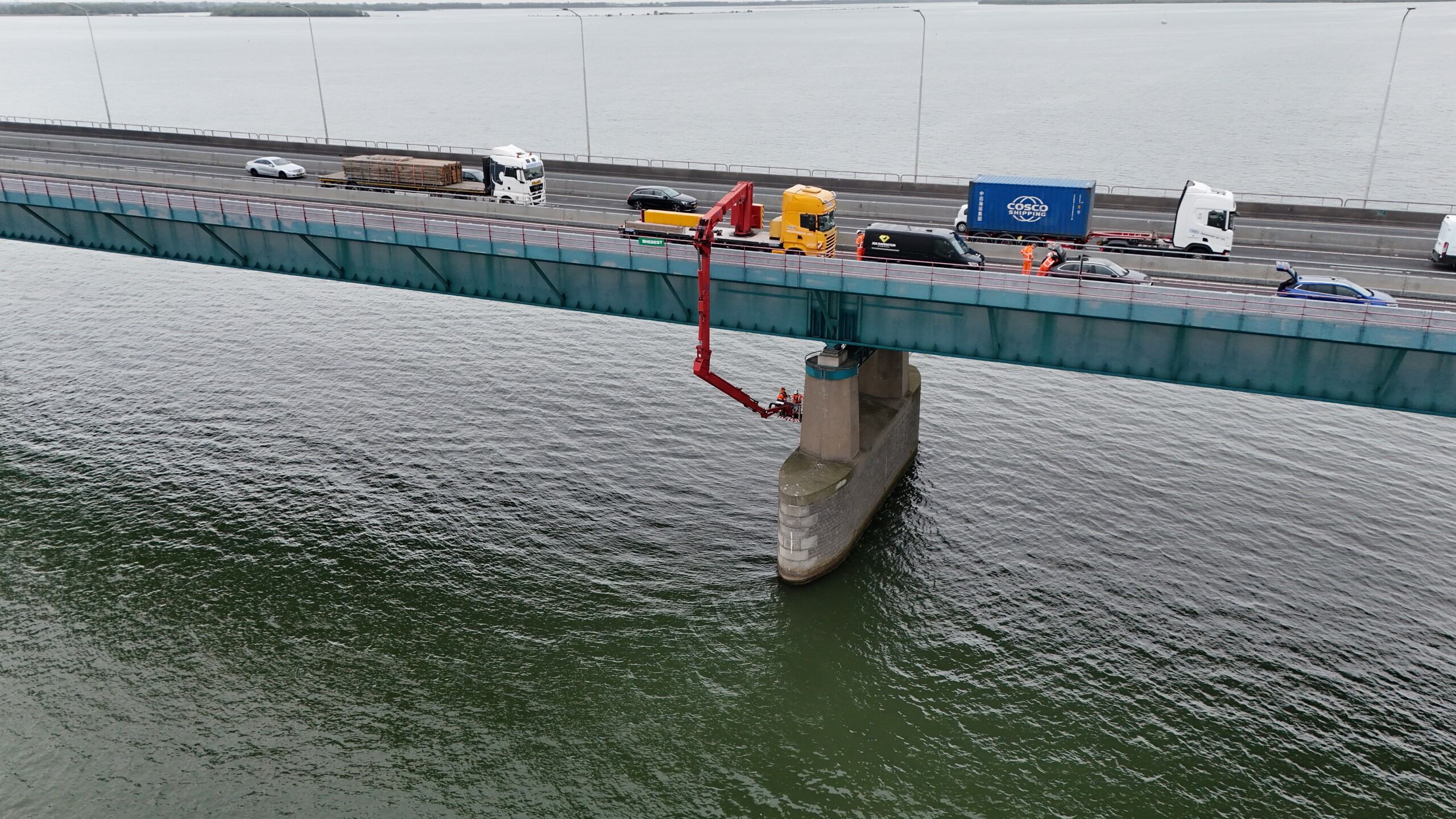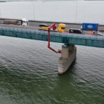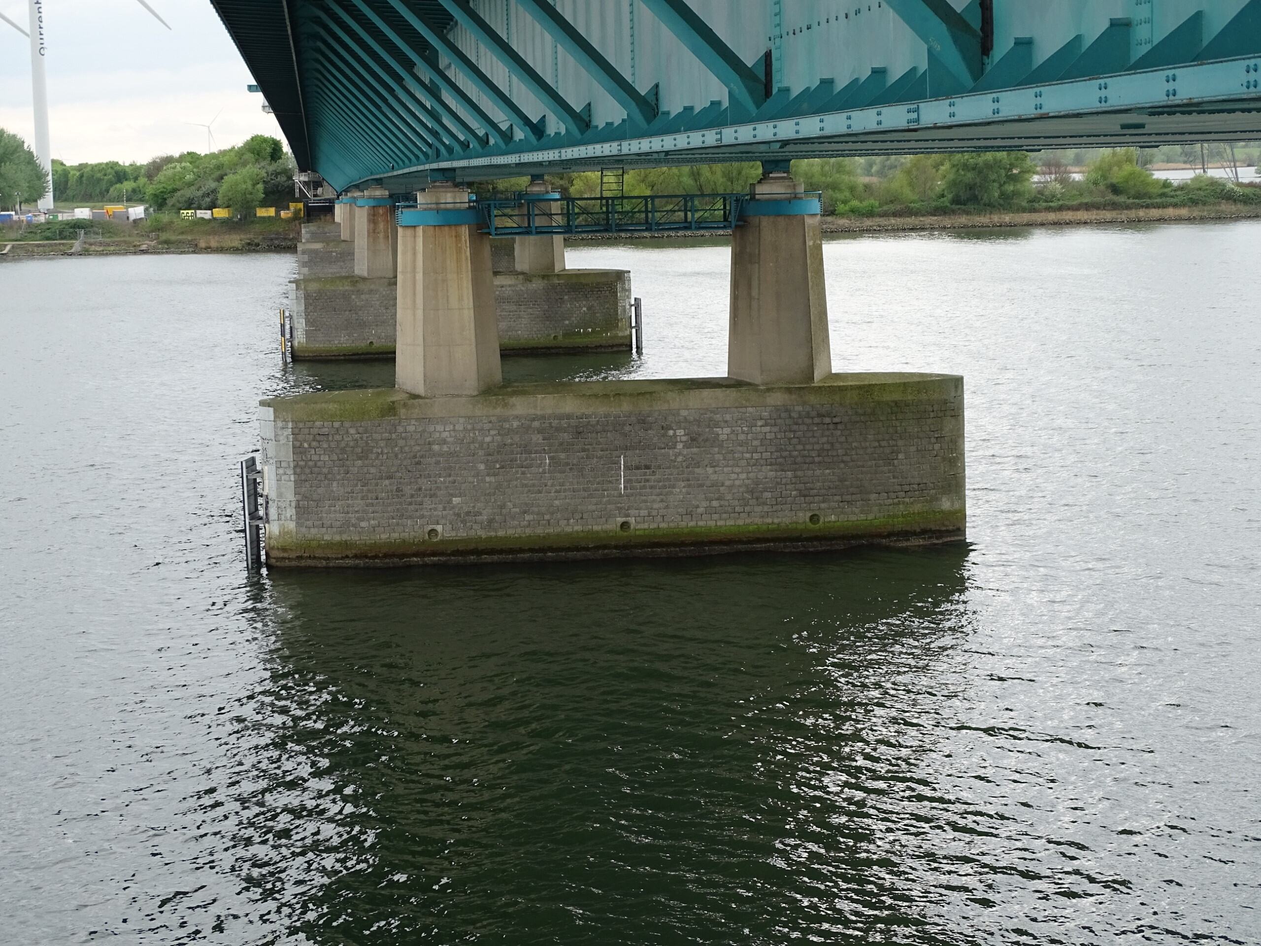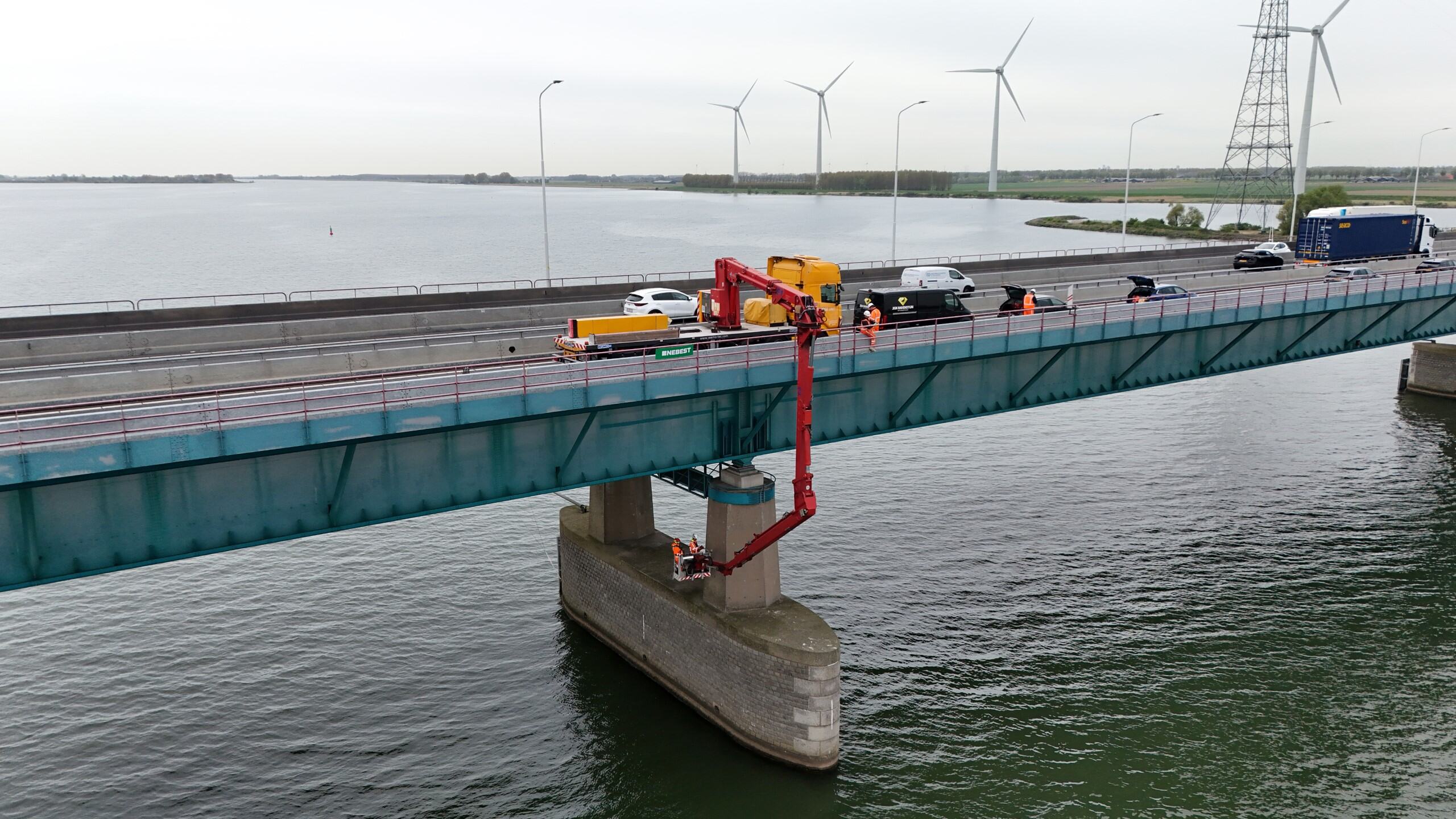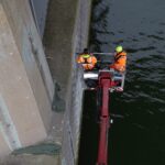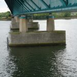 Rijkswaterstaat wil graag inzicht in de huidige onderhoudstoestand en kwaliteit van het beton van de landhoofden en pijlers. Onze materiaalkundig specialisten kregen van hen de opdracht dit inzicht te verzorgen. Onlangs voerden onze betonexperts in het kader hiervan uitgebreid onderzoek aan deze pijlers en landhoofden uit: van visuele inspecties en het bepalen van de betondekking, tot het nemen van boorkernen en het daarop uitvoeren van laboratoriumonderzoek naar carbonatatiediepte, chloridegehalte, druksterkte en splijttreksterkte. Dankzij een laagwerker konden ook moeilijk bereikbare locaties worden onderzocht – wat bovendien mooie plaatjes opleverde!