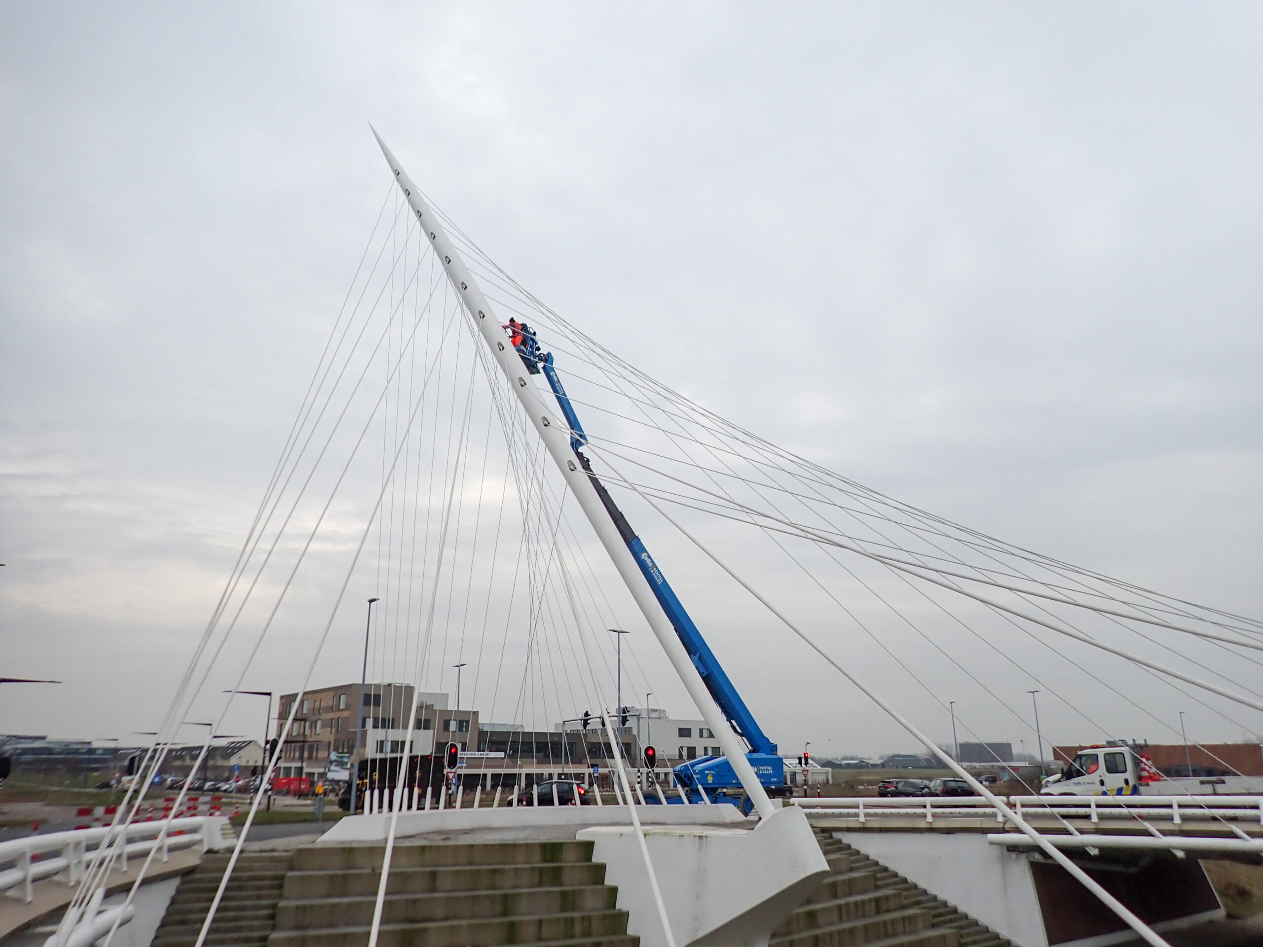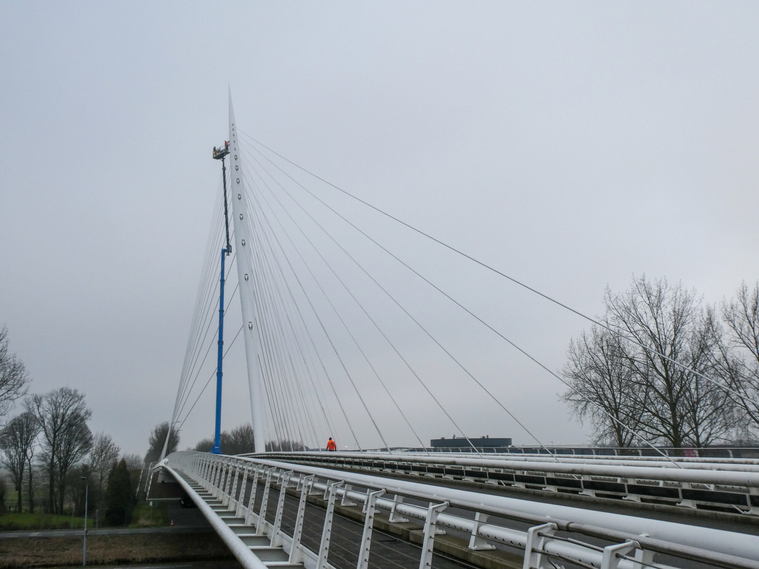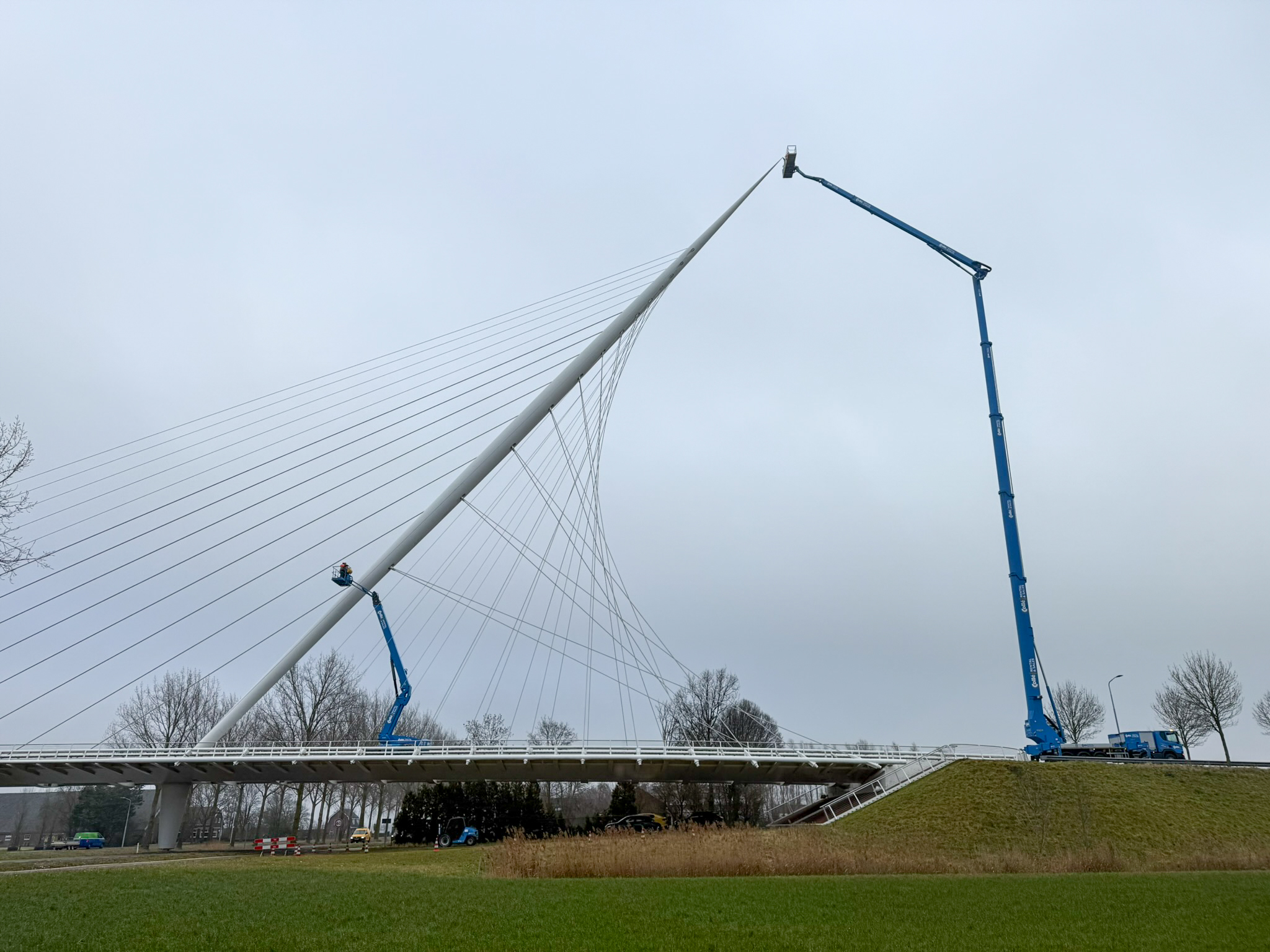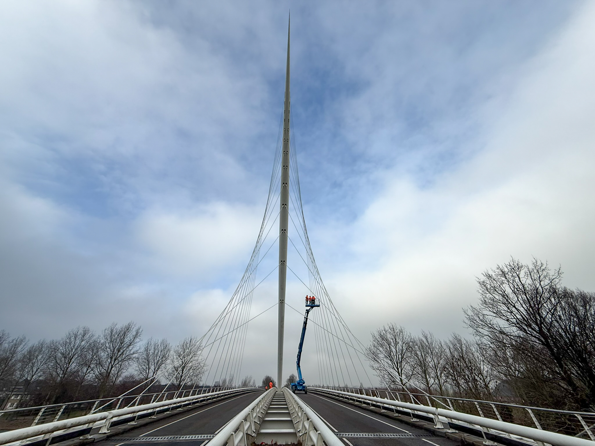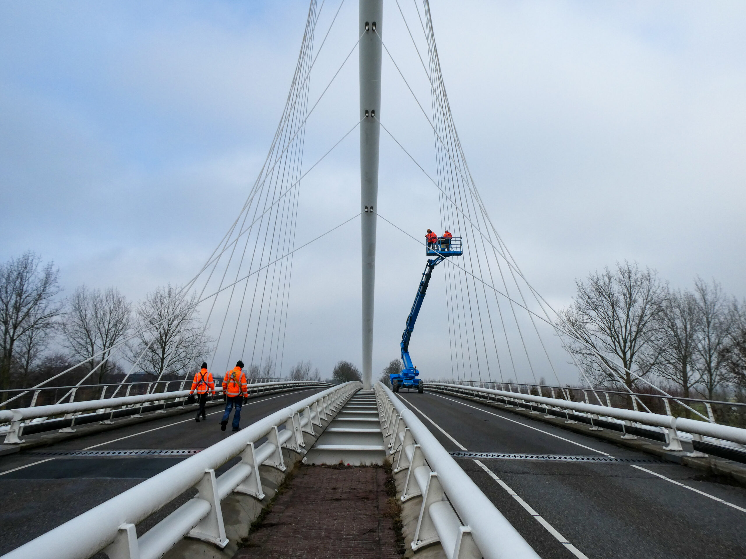 Tijdens de inspectie beoordeelden we zowel de brugdekken als de kenmerkende tuiconstructies en kabelverankeringen. Met behulp van verschillende typen hoogwerkers konden we alle onderdelen nauwkeurig inspecteren, van het brugdek tot de hoogste punten van de tuien en pylonen. Zo brachten we de onderhoudsstaat volledig in beeld, wat diende als betrouwbare basis voor het nieuw op te stellen onderhoudscontract.