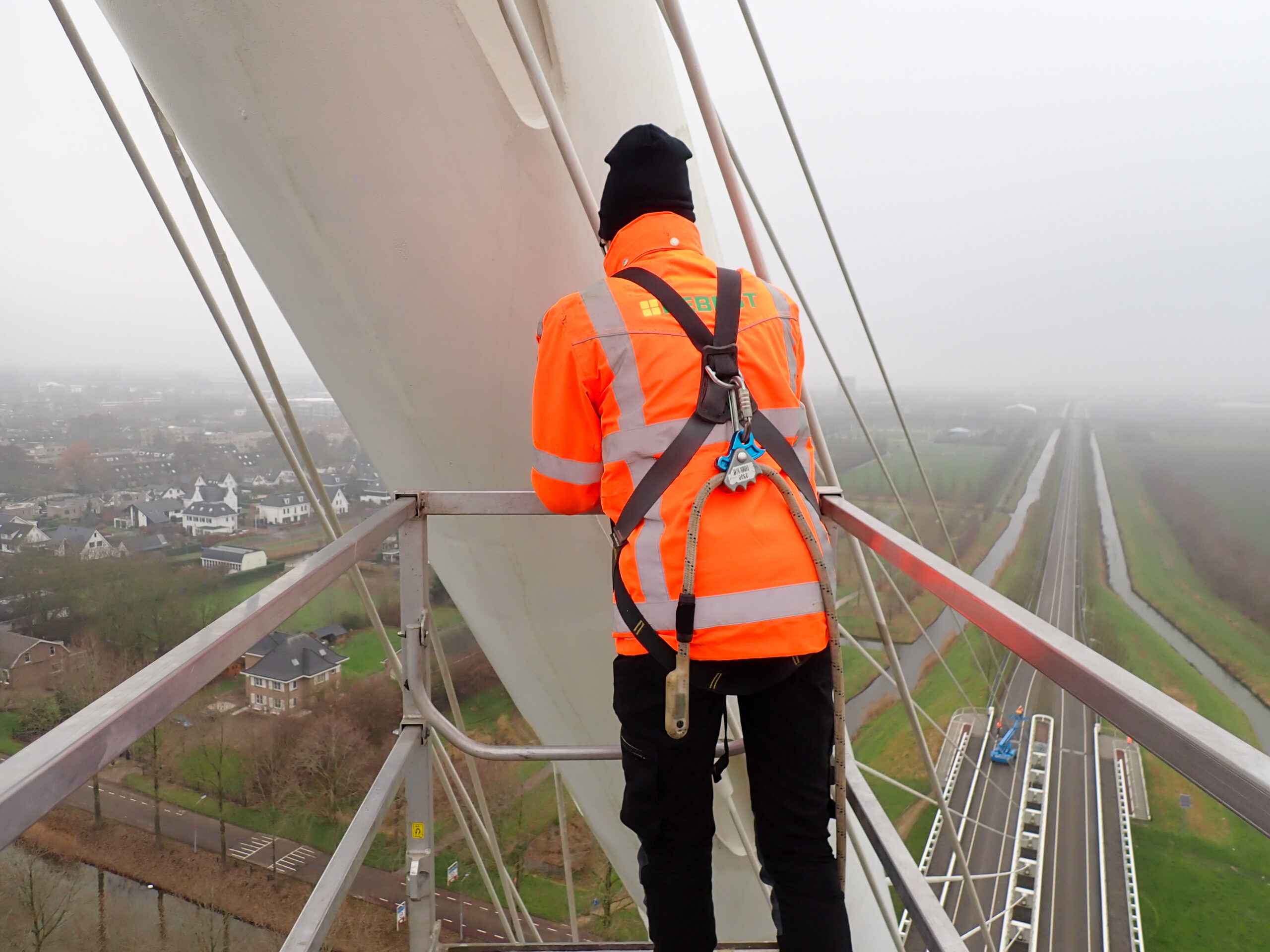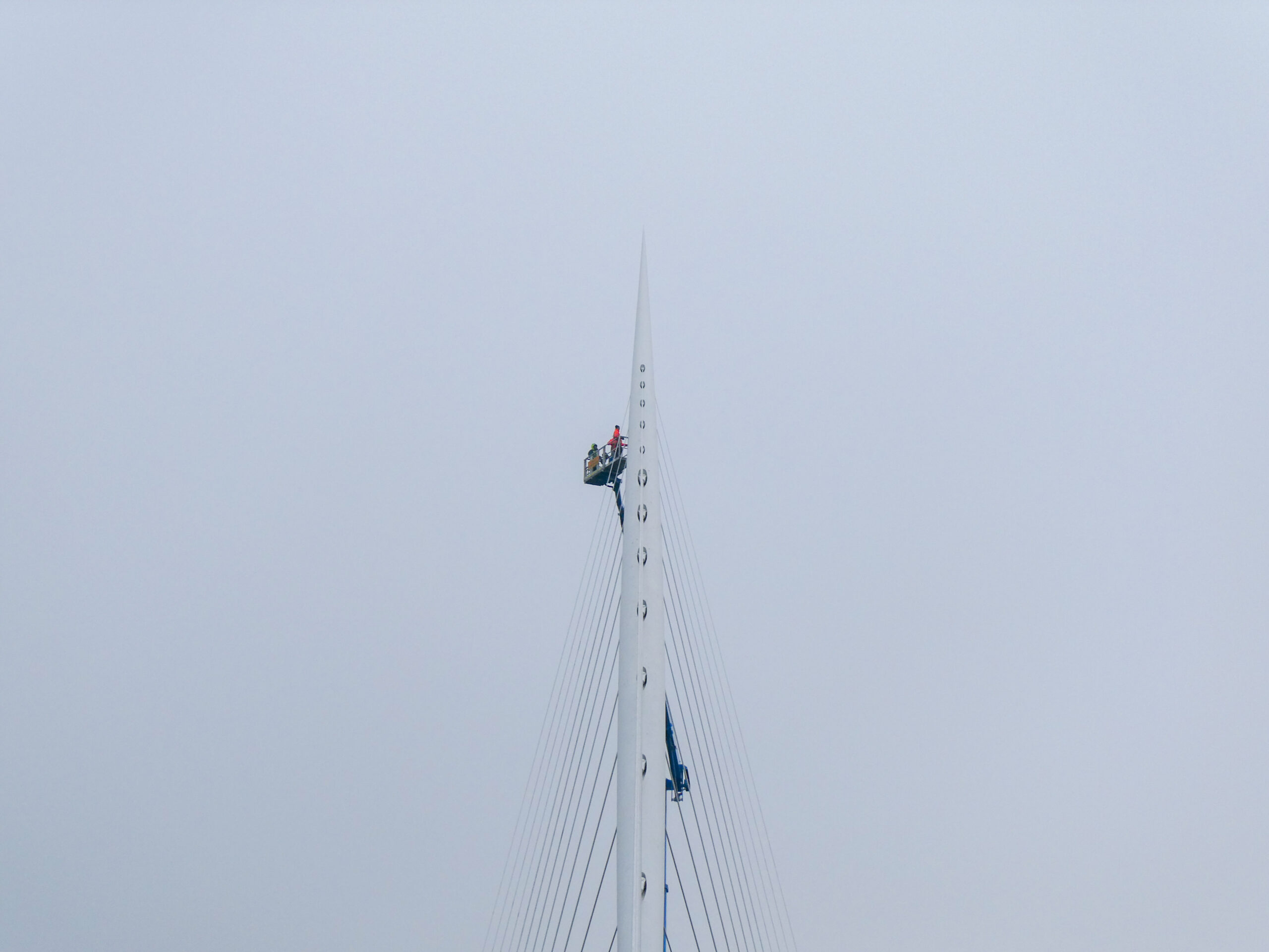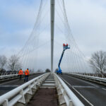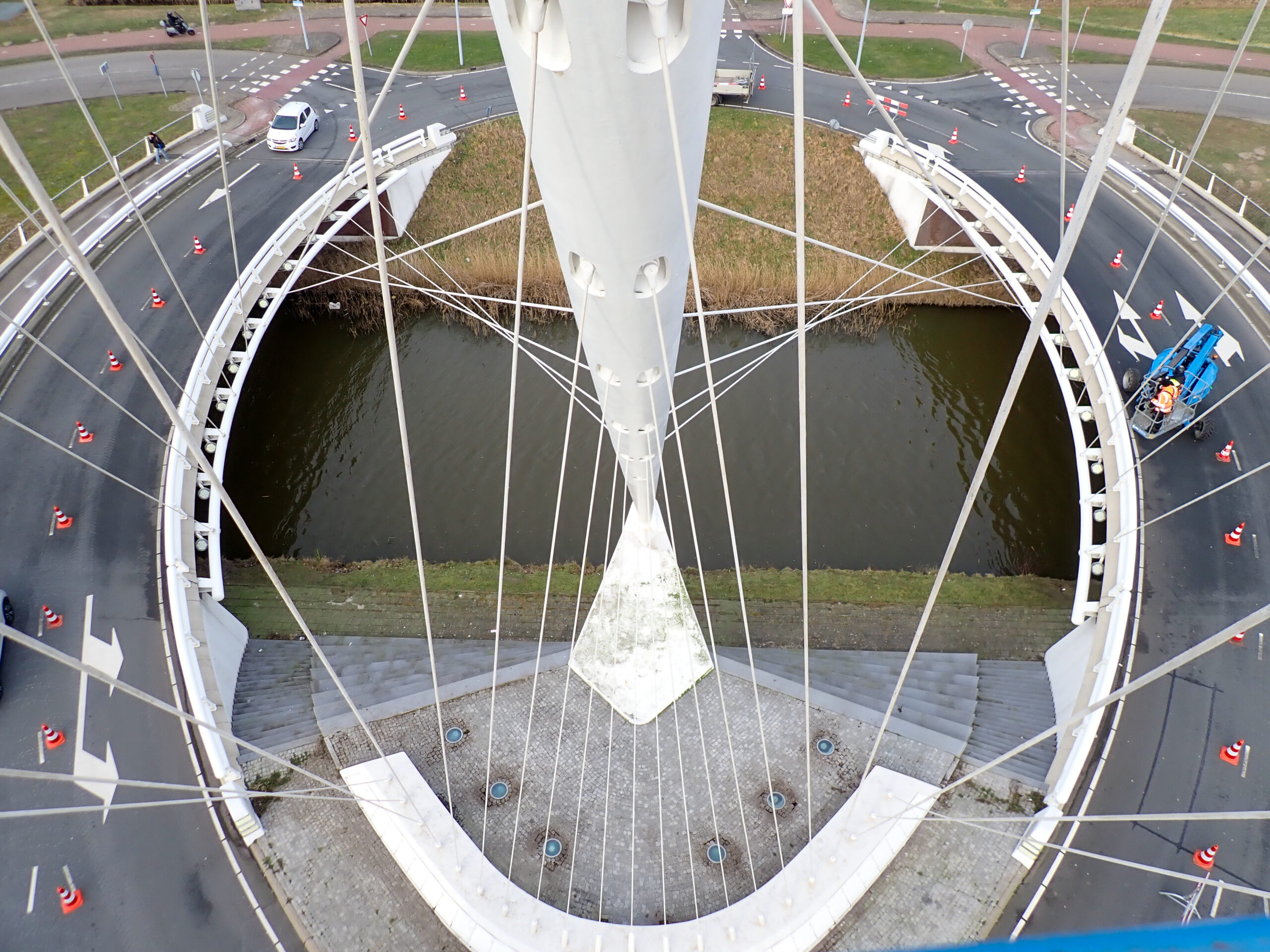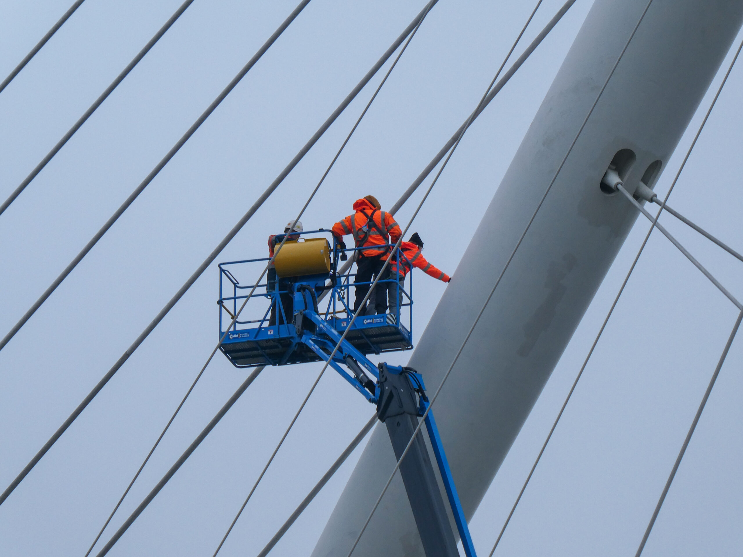 Tijdens de inspectie beoordeelden we zowel de brugdekken als de kenmerkende tuiconstructies en kabelverankeringen. Met behulp van verschillende typen hoogwerkers konden we alle onderdelen nauwkeurig inspecteren, van het brugdek tot de hoogste punten van de tuien en pylonen. Zo brachten we de onderhoudsstaat volledig in beeld, wat diende als betrouwbare basis voor het nieuw op te stellen onderhoudscontract.