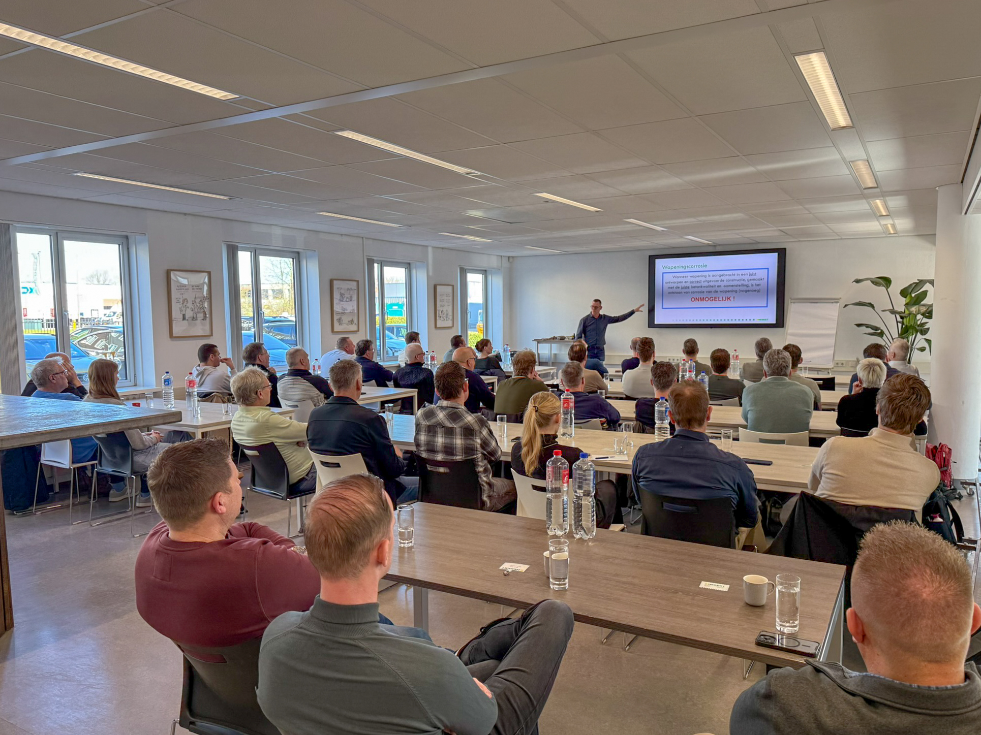 Betonexperts Edward Ermens en Maarten Swinkels deelden hun kennis over uiteenlopende aantastingsmechanismen, (niet-)destructieve onderzoeksmethoden en effectieve hersteltechnieken. Aan de hand van praktijkvoorbeelden en casestudies kregen deelnemers concrete handvatten die direct toepasbaar zijn in de dagelijkse praktijk. Een rondleiding in onze laboratoria, verzorgd door Wim Heerens en Michel de Haan, maakte de dag compleet.